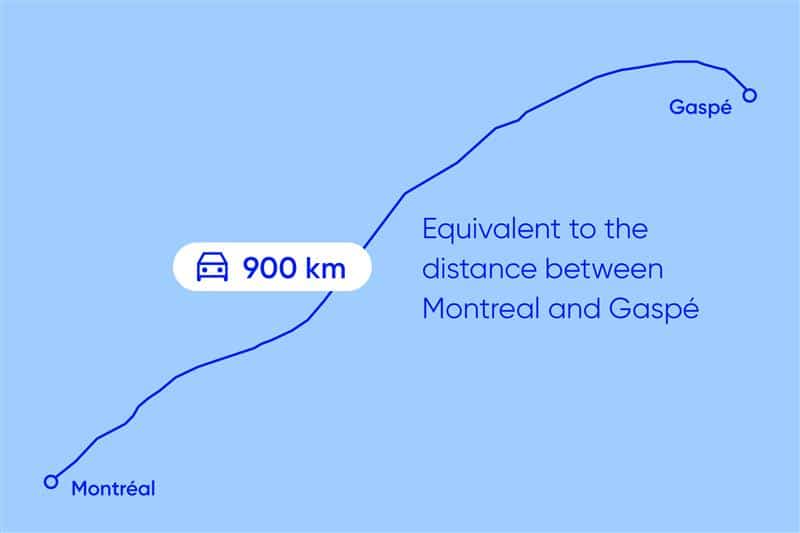 900 km of geothermal piping, equivalent to the distance between Montreal and Gaspé.