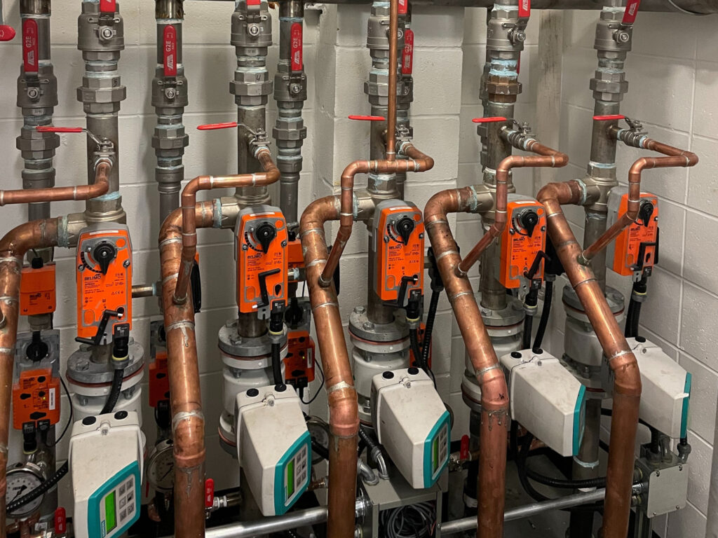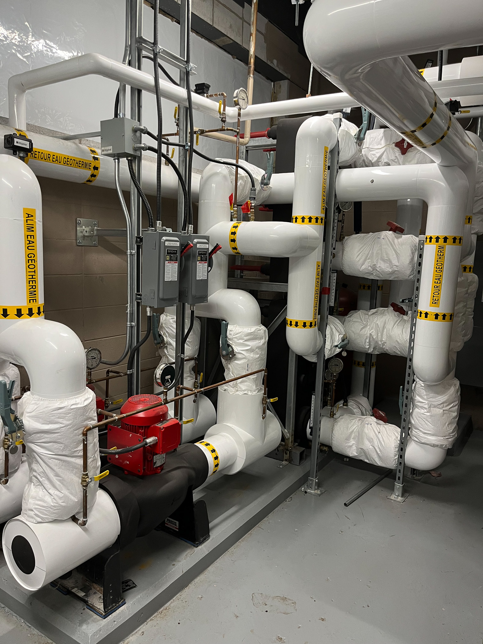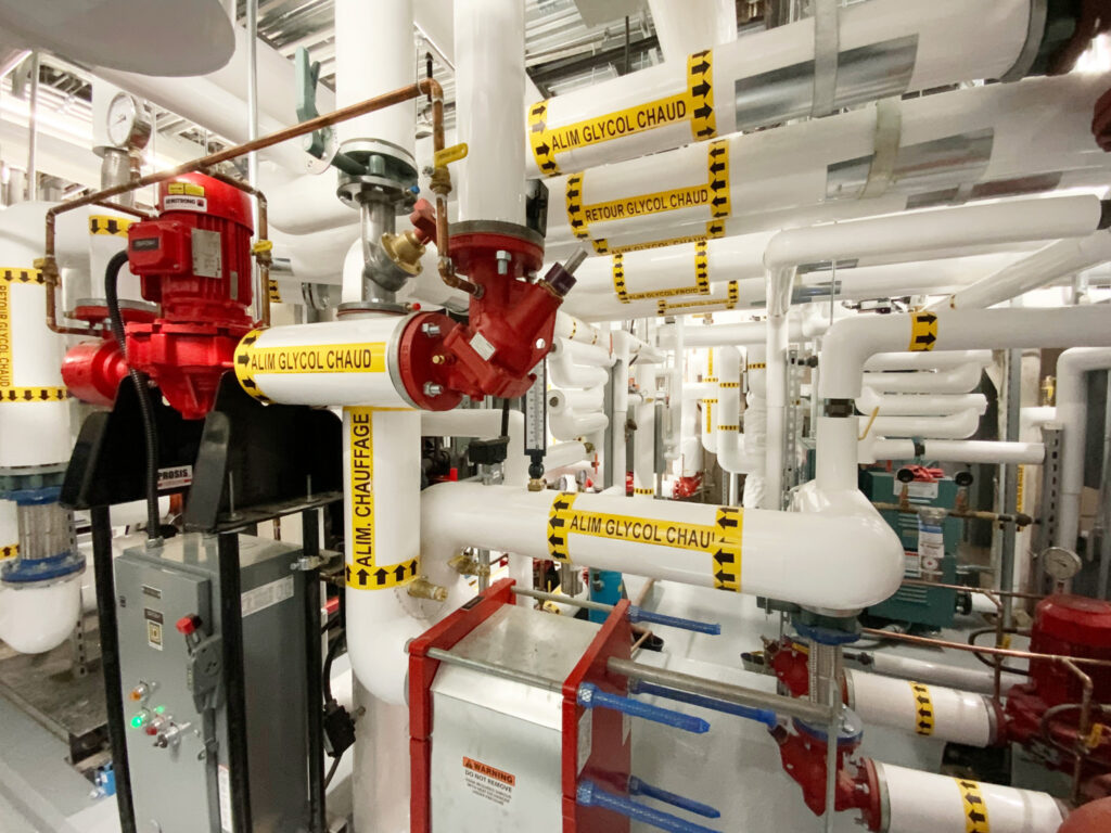 L’utilisation de l’eau souterraine amène plusieurs enjeux tels que la gestion des matières en suspension, le risque de colmatage et la durabilité des installations. Nos équipes ont répondu à ces enjeux, entre autres, avec l’ajout d’un système de filtration, un système de redondance des échangeurs à plaques afin de maintenir l’opération continue en période d’entretien et l’utilisation d’acier inoxydable pour assurer la pérennité du réseau.