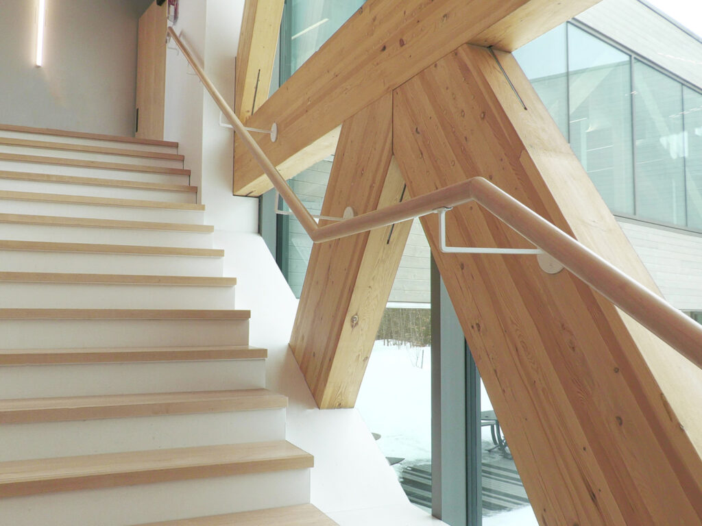 Une autre solution innovante dans la structure fût l’utilisation de murs rideaux avec meneaux porteurs en bois lamellé-collé. Les meneaux étant utilisés aussi comme colonnes portantes, cela comble deux besoins avec un seul élément structural.