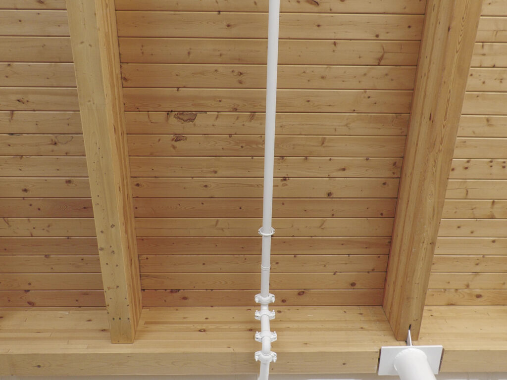 La plupart des panneaux de la charpente de bois arrivaient en d’immenses et uniques pièces sur le chantier. Puisque ces pièces sont également des éléments de finition architecturale du bâtiment, une attention et une sensibilisation ont été faites auprès des travailleurs afin de protéger ces précieux morceaux.