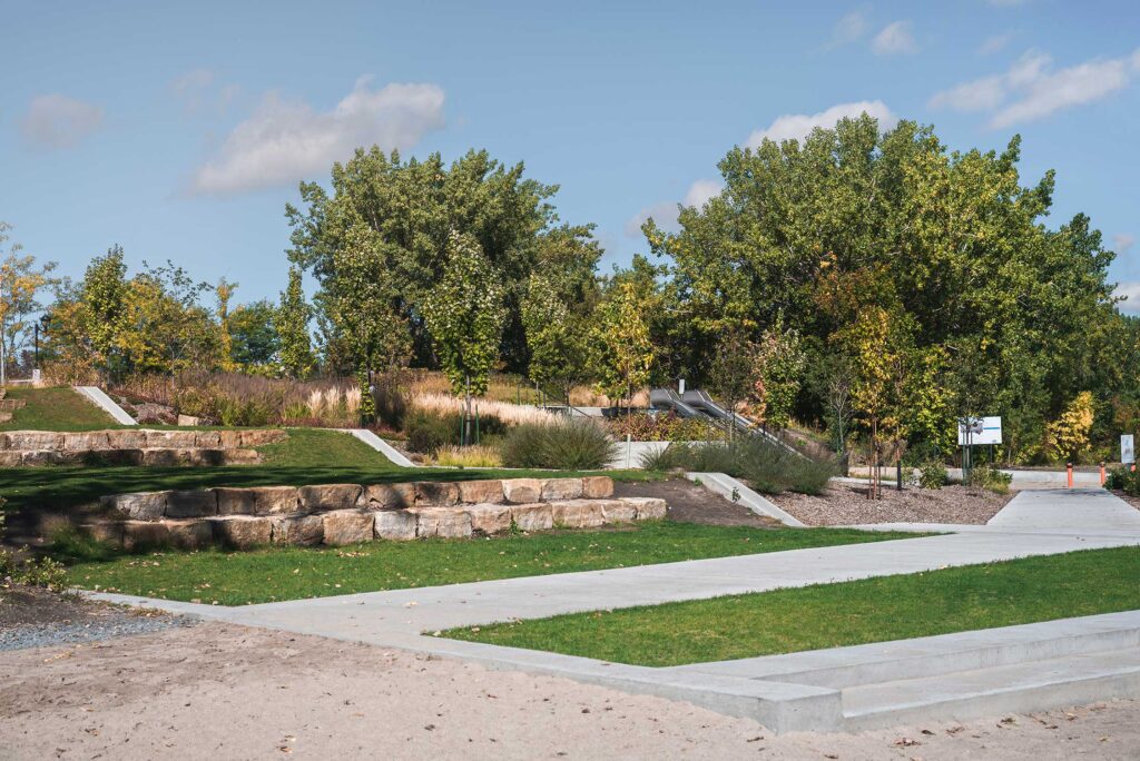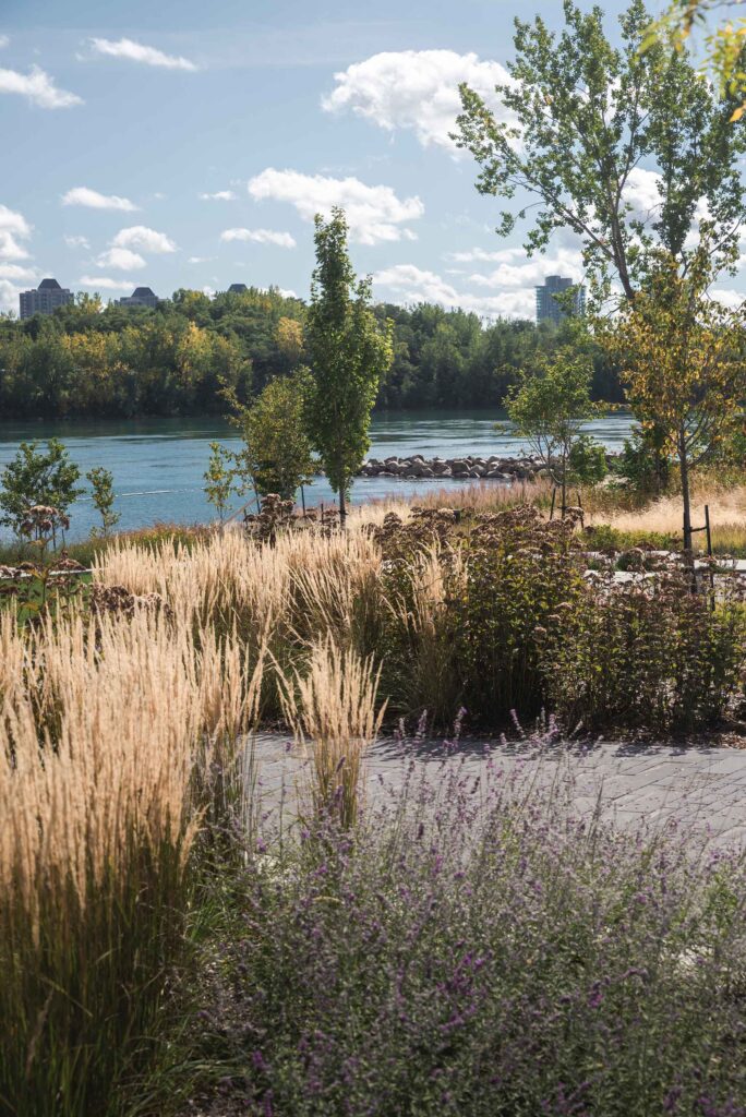 L’aménagement en rive se trouvant directement au-dessus d’un ancien site d’enfouissement, des travaux d’excavation, de nivellement, mais principalement de décontamination complète du sol, ont été nécessaires.