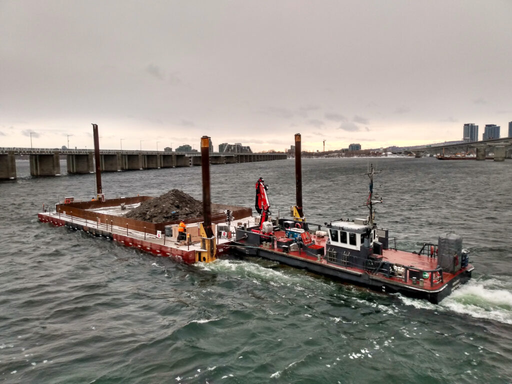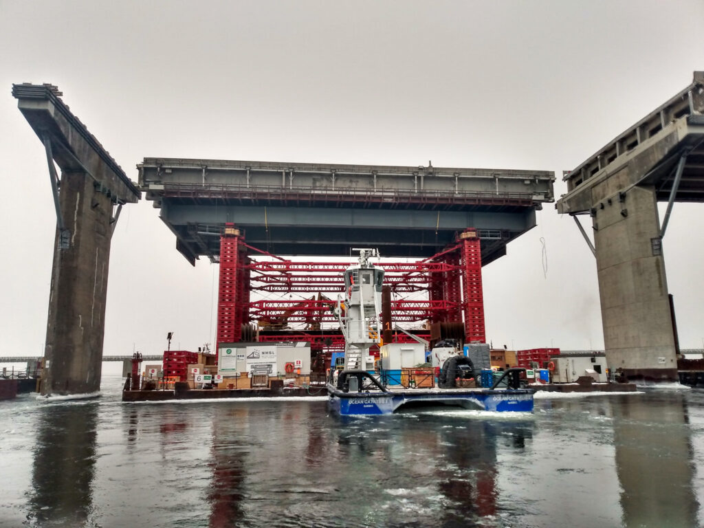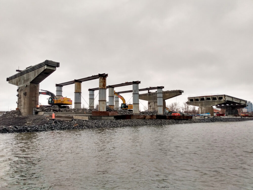 L’équipe de gbi a participé activement à la mise en œuvre d’une barge-catamaran, une immense plateforme flottante, pour déconstruire les travées situées au-dessus du fleuve. Cette plateforme, spécialement conçue pour la déconstruction des 30 travées entre la jetée de l’Île-des-Sœurs et la structure métallique de la voie maritime, capable de soulever et déplacer une travée complète d’environ 1 900 tonnes de béton, a représenté un véritable défi, tant lors de son élaboration et de sa conception que durant la surveillance des travaux sur le chantier. Pour la section surplombant la route 132 à Brossard, un secteur névralgique pour la mobilité dans la grande région de Montréal, une fin de semaine complète (du vendredi soir à 23 h au lundi matin à 5 h) a été dédiée pour déconstruire quatre travées et trois piliers, représentant environ 12 000 tonnes de béton retirées.