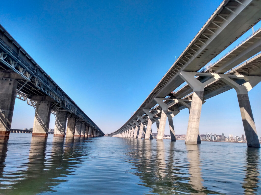 - 48 piliers et semelles supportant ces travées en béton au-dessus du fleuve Saint-Laurent, ainsi que d’autres situés en dehors du fleuve sur les rives.