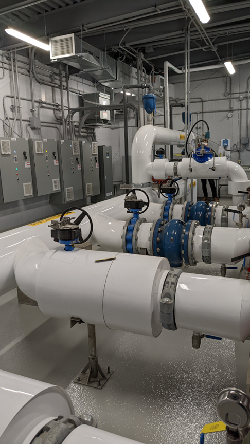 Le projet a présenté plusieurs défis techniques et logistiques majeurs. Il a fallu assurer le maintien du réseau d’aqueduc en service tout au long des travaux, sans interruption pour les usagers. Il était également essentiel d’anticiper les impacts du fonctionnement du système de pompage, afin d’éviter tout problème hydraulique, tel que la surpression ou les coups de bélier, et de définir des scénarios adaptés en cas d’incendie, de panne de courant ou de travaux d’entretien. Enfin, il a été nécessaire d’évaluer l’impact des variations de pression sur les systèmes de gicleurs et sur les équipements des commerces du secteur.