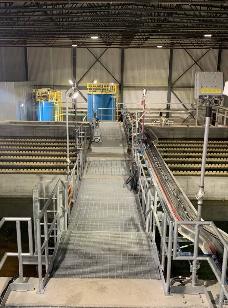 L’intégration de deux décanteurs lamellaires de type Densadeg représente une particularité clé du projet. Chaque décanteur comprend un réacteur de coagulation et de contrôle du pH, ainsi qu’un réacteur de floculation. Cette technologie avancée assure une décantation rapide et une clarification optimale de l’eau, en favorisant l’élimination des matières en suspension et des métaux. Ce procédé permet d’atteindre des performances élevées, même en présence d’une grande variabilité de l’eau brute.